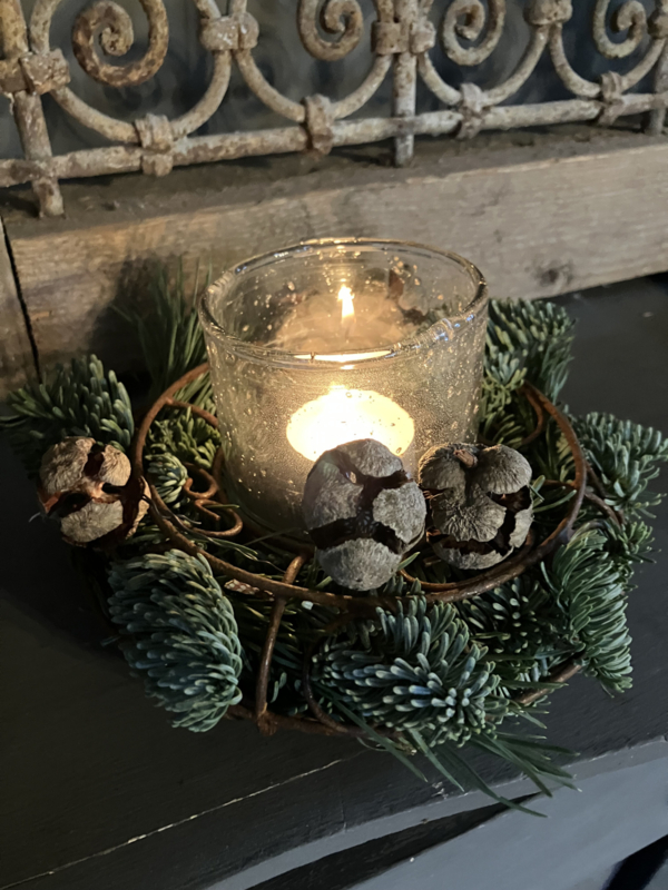 Draadmetalen krans in roestkleur.