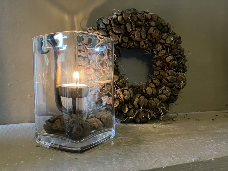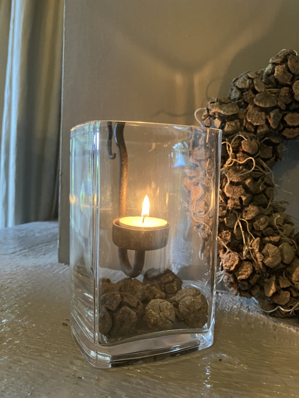 Glazen windlicht 9x9x15cm. Met zaaddozen en glashaak kandelaar. (Voor waxinelichtje).