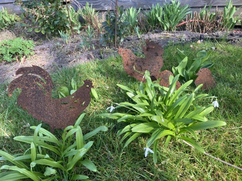 Kip, haan met 2 kuikens roest metaalStevige kwaliteit. Roest metalen haan 30x26cm, kip 26x21 en 2 kuikens 15x12cm. Gemeten excl prikkers